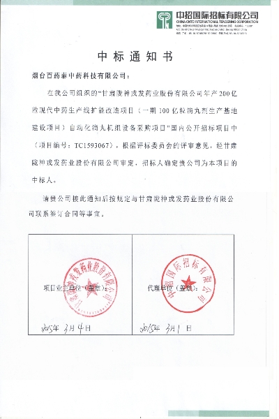 2015年2月12日,中招國(guó)際招標(biāo)有限公司受甘肅隴神戎發(fā)藥業(yè)股份有限公司委托,對(duì)年產(chǎn)200億粒滴丸劑生產(chǎn)線擴(kuò)能改造項(xiàng)目(一期100億粒滴丸劑生產(chǎn)基地建設(shè)項(xiàng)目)2條滴丸機(jī)生產(chǎn)線公開招標(biāo),我司中標(biāo)。據(jù)悉,2014年隴神戎發(fā)藥業(yè)元胡止痛滴丸銷售額3.1億元, 是國(guó)內(nèi)單一滴丸品種年銷售過(guò)億元的3個(gè)品種之一。